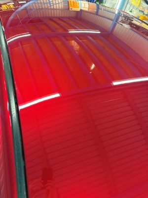 再塗装されたボンネットとルーフは、マスキングして肌調整&仕上げ磨き。